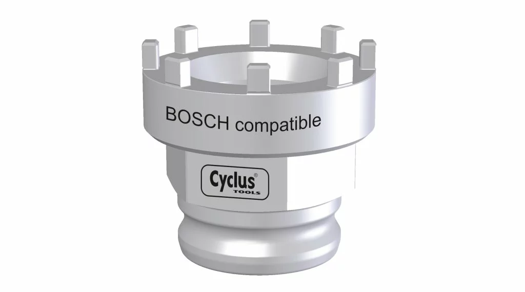 Avec cet outil de montage de Cyclus Tools, l’écrou de contre-écrou peut être monté et démonté avec le moteur électrique Bosch. Cet outil utilise une nouvelle denture plus large et plus large que celle utilisée précédemment. Cela garantit que la connexion produite par l’engagement positif peut transmettre tous les couples requis à tout moment.