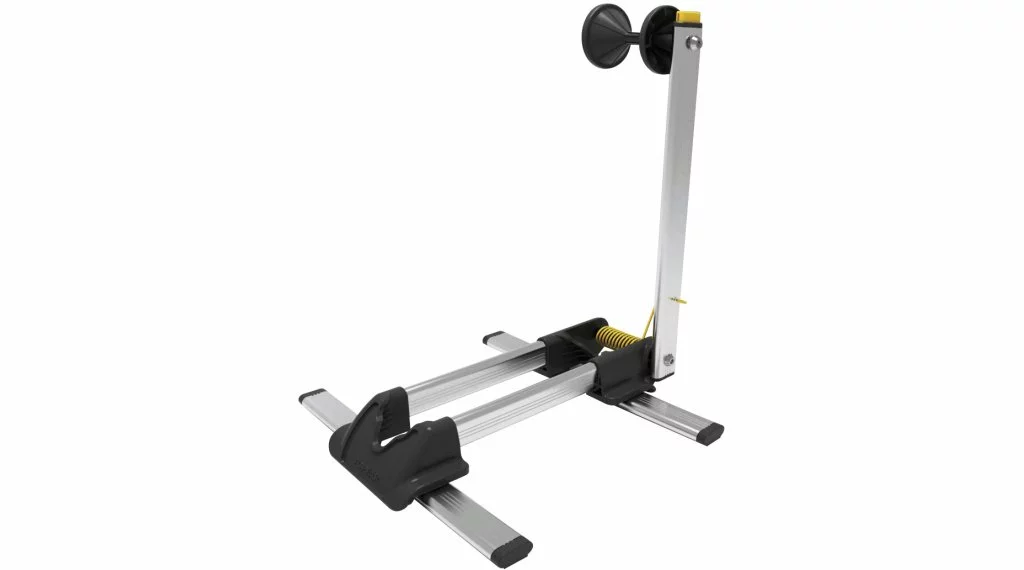 Support compact et pliable pour toutes les tailles de pneus de vélo de 20 « – 29 ». Le mécanisme à ressort s’adapte automatiquement à n’importe quelle taille de pneu. Idéal pour ranger la tente de l’équipe ou dans l’atelier.